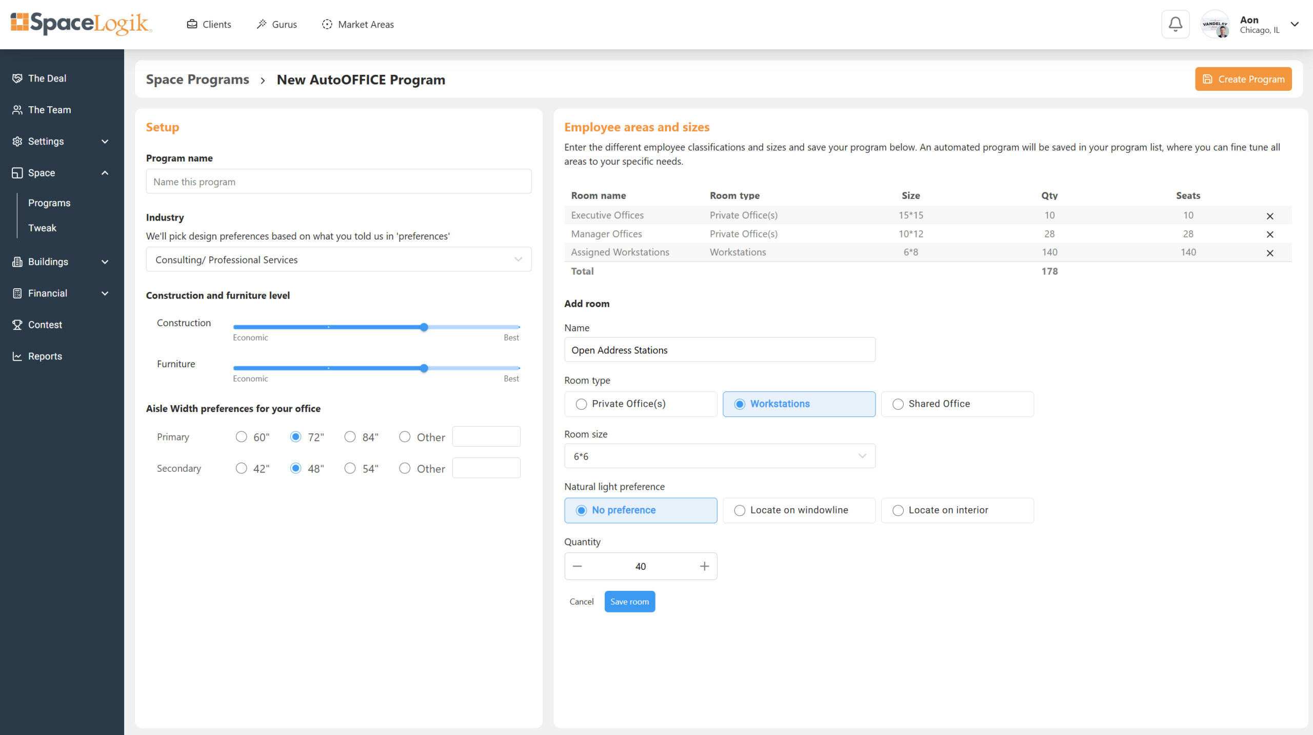 The Auto-Program feature builds full space programs and construction specifications in seconds by simply entering the employee headcount and their preferred workspace.